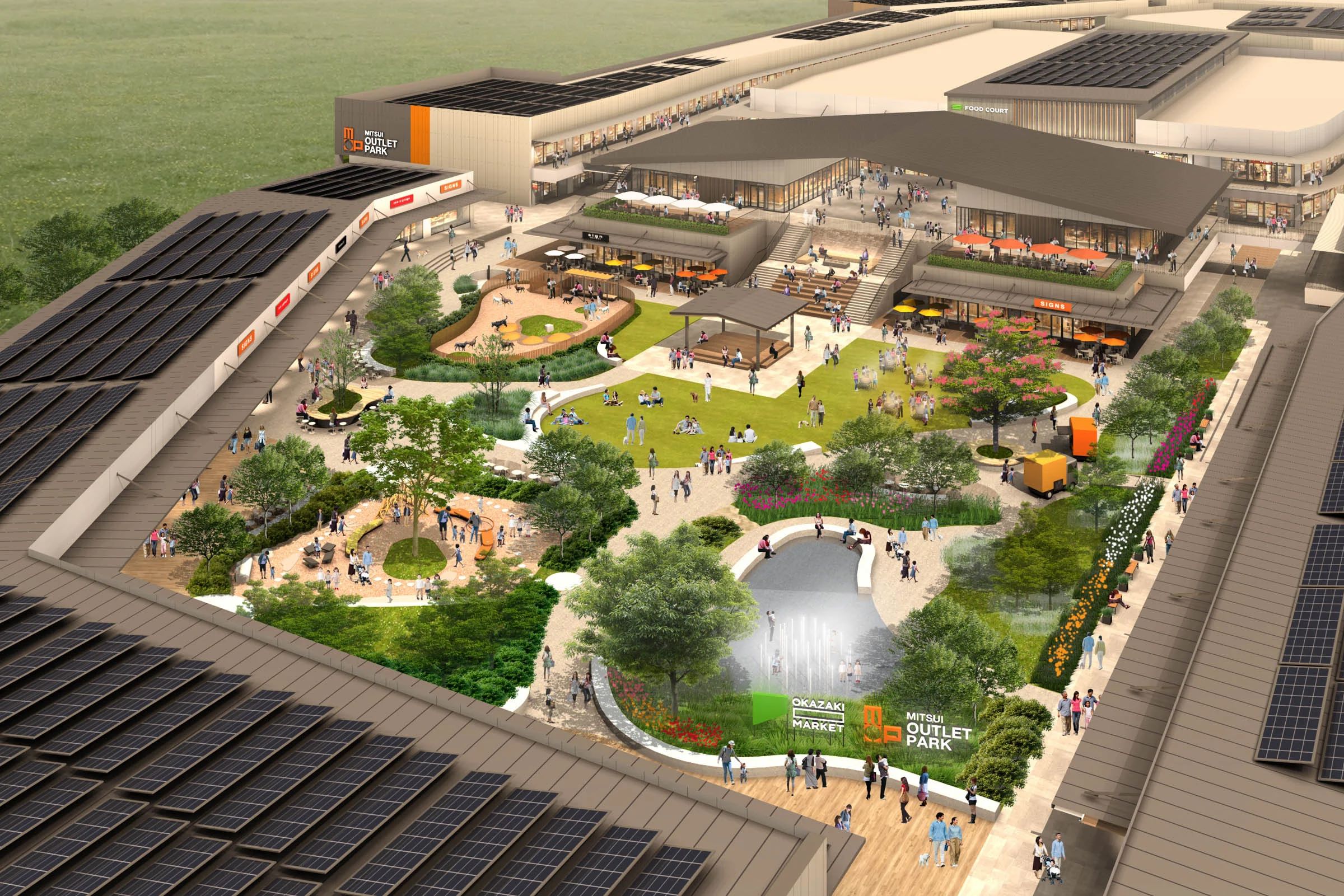 施設内は「アウトレットゾーン」と「OKAZAKI MARKET(オカザキマーケット)」の2エリアで構成され、緑に囲まれた開放的な空間で買い物や食事、散歩を楽しむことができます。公園型のマーケットには地元食材を使った飲食店やドッグラン、子どもが遊べる広場も設けられ、家族やペット連れでも快適に過ごせます。