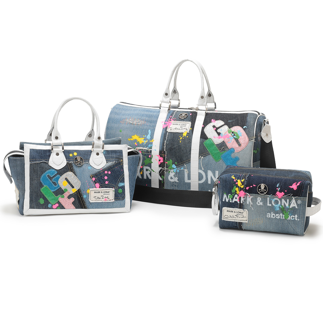 『MARK & LONA』青山店と公式オンラインストア限定で販売されるヴィンテージデニムや廃棄生地をアップサイクルしたアクセサリーコレクション。デニムの分解から表面のペイント、縫製まで全ての作業を日本国内の職人の手により、ひとつ、ひとつ丁寧に作られています。カラフルなスプラッシュペインティングやスプレーを使用したステンシルプリント、クロコ調のエンボス加工を施したシンセティックレザーや鏡面プレートなどを使用した世界に一つだけの作品を提供します。