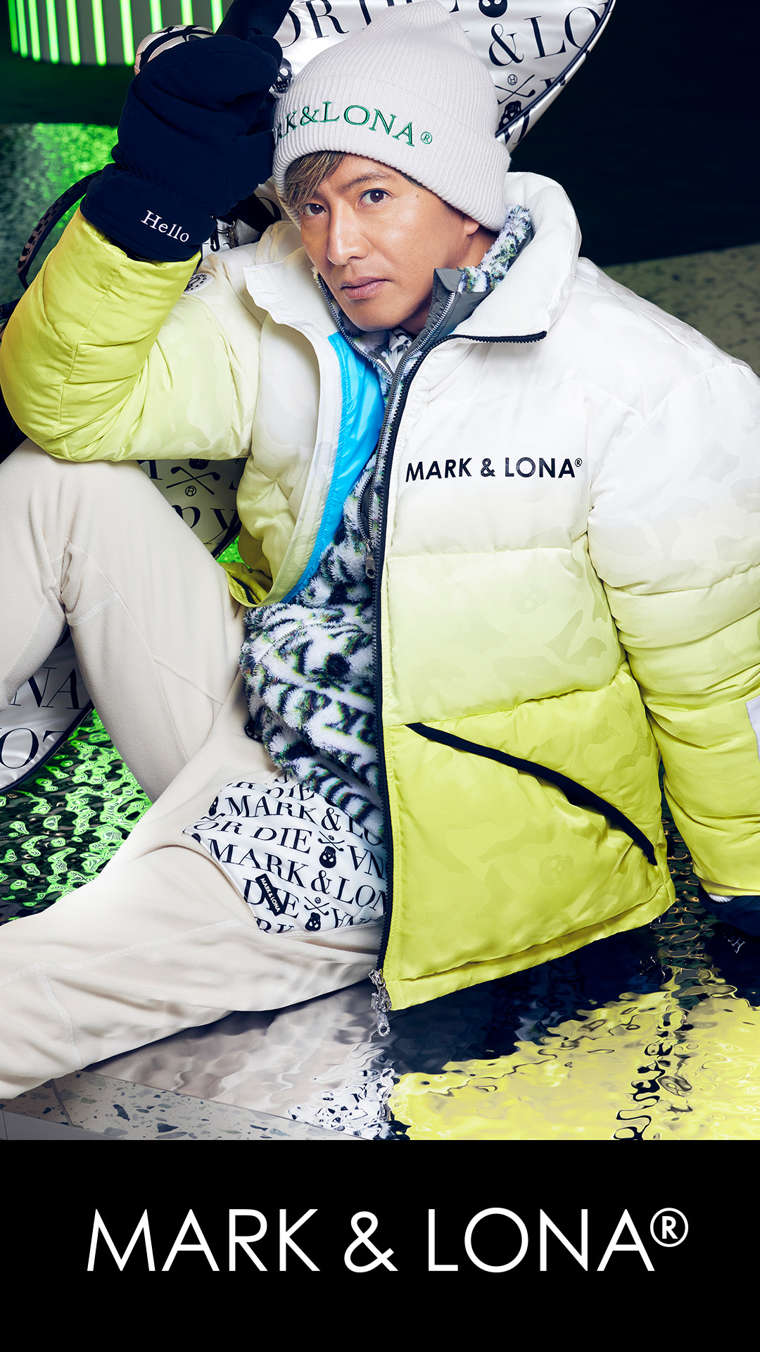 第5弾では、MARK & LONAのシグネチャーパターンであるスカル × カモフラ柄のジャカード素材を全面にデザインしたグラデーションダウンジャケットを着用。防寒着としての着用を目的としたビッグシルエットながら、非常に軽量で動きやすいためフレキシブルなプレーや着脱が可能です。中綿は、ダウン90% / フェザー10%、700フィルパワー以上の軽くて暖かい高品質ダウンを採用しています。