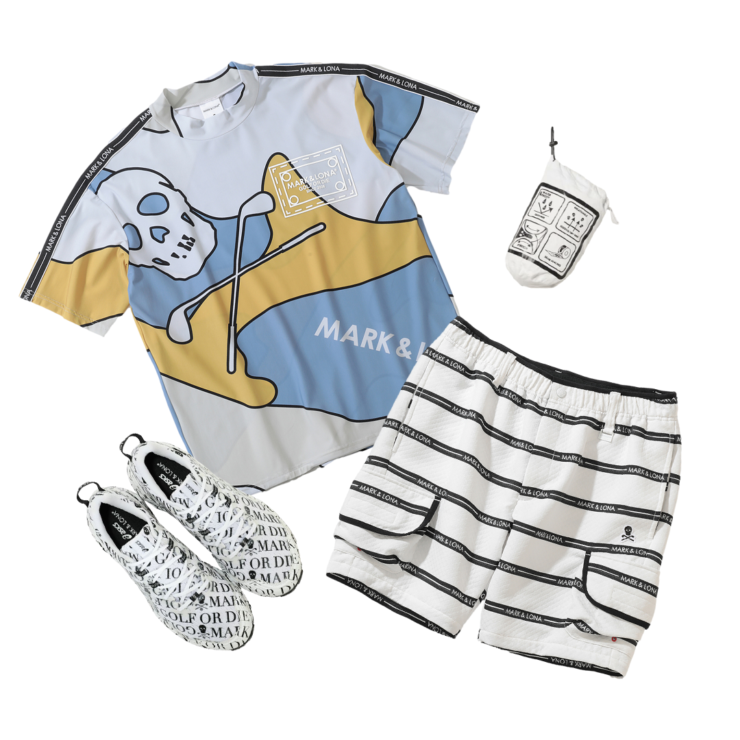 CM内で着用しているのは、MARK & LONAのシグネチャーパターンであるスカルとカモフラージュ柄をダイナミックにプリントしたモックネックティーで、イタリア EURO JERSEY社の”SENSITIVE”と名付けられた特許取得素材が採用されています。高い通気性と速乾性、UVカット効果、さらには型崩れしにくく、紫外線による色あせにも強い素材で、真夏のラウンドをアシストしてくれます。派手すぎない鮮やかな配色が特徴的な、バランスの取れた1着です。