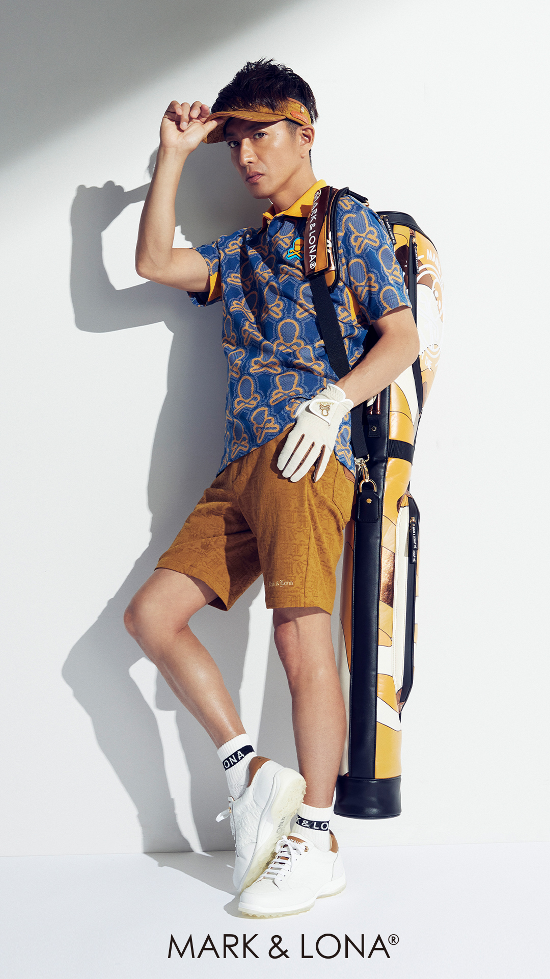 また、アクセントとなるサンバイザーは、ボトムスと同じデザインのものを合わせて、まとまりのあるワントーンコーデに仕上げています。さらに練習場へのクラブの持ち運びにも便利な肩掛けのレンジケースは、メタルのシンセティックレザーに、MARK & LONAのシグネチャーパターンであるスカルxカモフラ柄がダイナミックに全面プリントされています。コース外でもおしゃれを楽しみたい方にぴったりな、存在感のあるアイテムです。